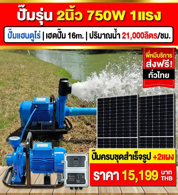 - สเปค : เฮดปั๊ม 16ม./ปริมาณน้ำ 21,000ลิตร/ชม.| แผงโซล่าเซลล์ 2แผง